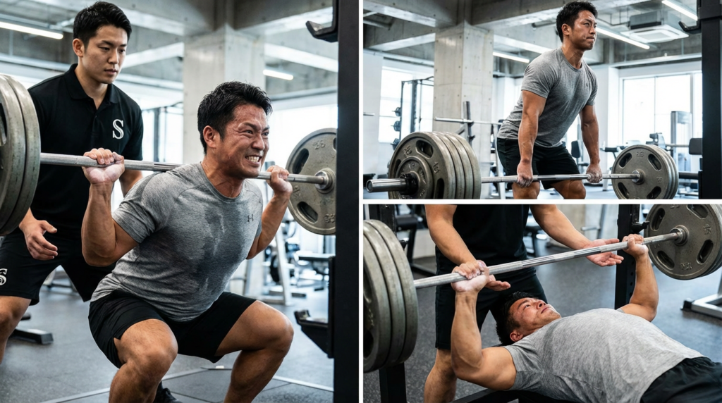 - ベンチプレス、スクワット、デッドリフトなどの複合種目